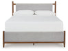 Casual contemporary design. Made with hardwood solids, Mango wood veneer and MDF substrates. Finished in a medium natural wood tone. Clean case designs sit on round tapered legs with thick front frames and overlay drawer fronts for added dimension. Drawers feature French/English dovetail construction, fully finished interiors and heavy duty ball-bearing side glides for durability and smooth function. Stylized poster bed with rounded solid wood frames and a sling style headboard cushion covered with a soft gray fabric.