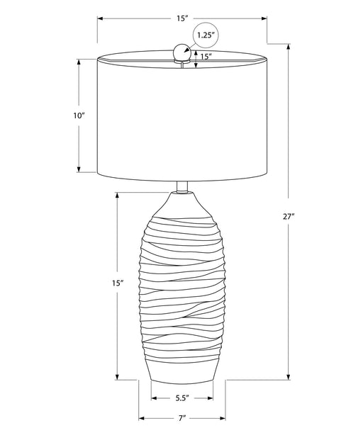 Modern Design: Vase-like shape with textured grey resin body, flowing lines, and an ivory linen drum shade, topped with a black round finial. ...