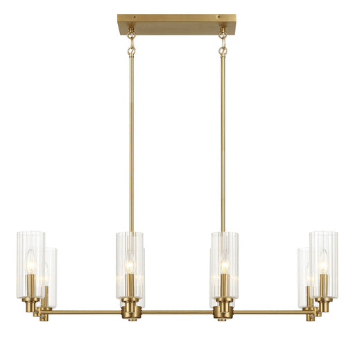 Elegance and Warmth: The Willow Eight Lights Island combines clear ribbed glass with a satin brass finish, infusing any room with elegance an...