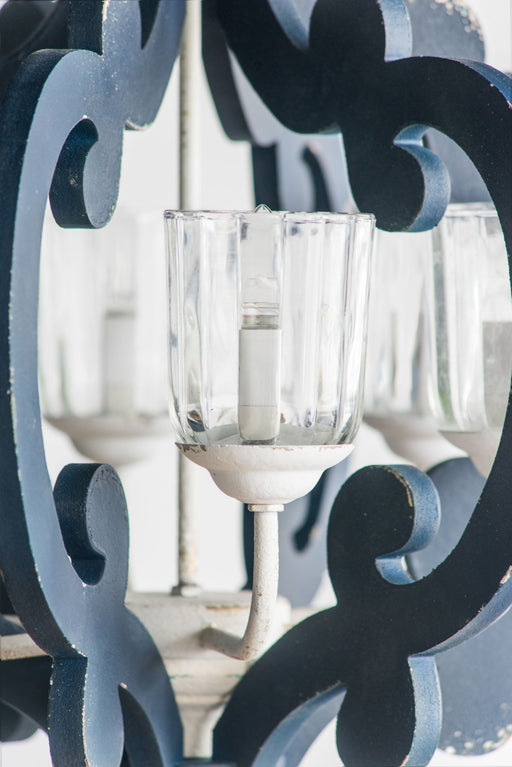 Design: Blue wooden chandelier with white accents, ideal for cottage or coastal style spaces. Lighting: Features 6 light sources, suitable f...