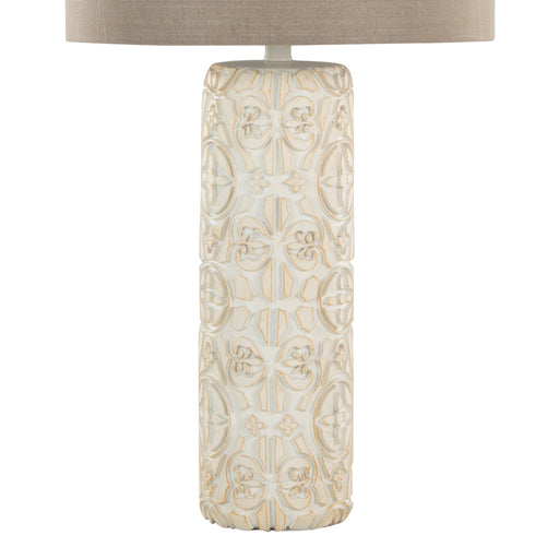 Elegant Design: The Charlotte Table Lamp boasts a stunning polyresin base with an intricately carved pattern and a matching finial, providing...