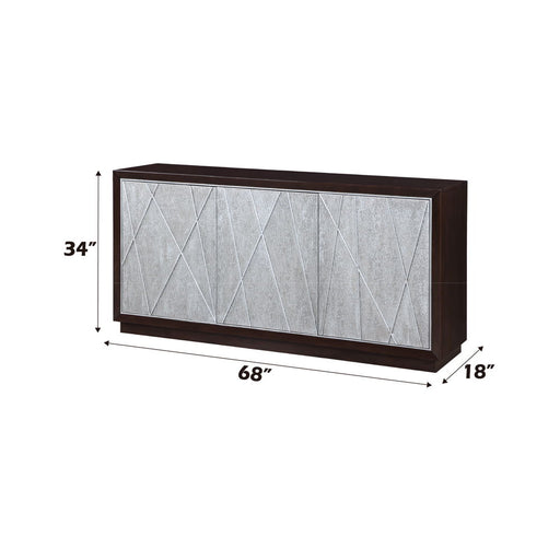 Our Geranio console cabinet has artfully scored antiqued metallic silver door fronts that are etched in an abstract design. The cabinet with its wa...