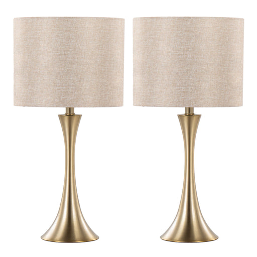 Illuminate your contemporary space with this table lamp. Finished in an antiqued goldtone, it makes a statement displayed solo, or as a pair flanki...
