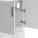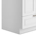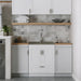 - Cabinet is constructed with melamine, and doors and drawer front are wrapped with PVC, materials that are highly durable, low maintenance, and water resistant
