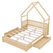 Queen Size House Platform Bed With Guardrail And 2 Drawers - Natural