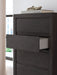 Find serene simplicity in the clean lines and dark neutral tones of this chest of drawers. It’s a sincere approach to modern elegance, giving you high style at a great value. A sleek hardware-less design creates a fuss-free look. Short on storage? This chest's smooth-gliding drawers keep clothes and clutter neatly tucked away.