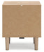 Clean-lined and contemporary—but far from stark—this nightstand is a fresh style awakening. Pairing a light finish with replicated oak grain and textured beige details that replicate the look of cane, its mixed materials bring a naturally versatile vibe to your bedroom. Sleek, simple hardware plays perfectly with the modern aesthetic. A smooth-gliding drawer and USB charging keep your clutter contained and your gadgets powered. Warm LED lighting not only illuminates your restful retreat but also adds a touch of unmatched style.
