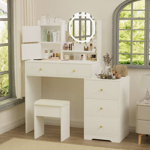 Adjustable LED Lighting: Features 3 color temperatures for precise makeup application. Space-Saving Design: Compact vanity with drawers and open s...