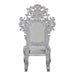 See the extravagant style and classical design all over the Valkyrie Dining Room Collection. Bold, intricate scrollwork accent is highlighted throughout each piece in this collection. Antique Platinum Finish paired with muted gray tone brings attention to its gorgeous details. Rectangular dining table showcases a timeless pedestal-style silhouette while matching chairs feature button-tufted upholstery for lavish comfort. Bring a dramatic change to your home with the Valkyrie Dining Room Collection.