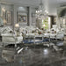 Introducing one of our most famous collections, Dresden in a new antique pearl white finish. This chair has a classic feel, featuring decorative carvings throughout the frame, that create a classic piece. Sitting on claw feet for style and stability. It is hand-brushed with silver accents that make the carvings pop. Upholstered in luxurious synthetic leather for a modern touch. The backrest is button tufted with crystal-like buttons for glamour and drama. Finished off with classic nailhead trim. Two throw pillows are included.