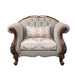 A new addition to Acme's collection of exclusive designs, the Miyeon chair in cherry finish is full of handsome details. Nailhead trim along the padded seat base runs up the scrolled arms and arched seatbacks. Button tufting on the seatback makes the fabric upholstery look especially cozy. Raised floral motifs embellish the Queen Anne legs of the piece.