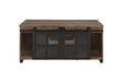 The rustic wooden frame and industrial metal accent complement each other perfectly. The coffee table embodies a raw, utilitarian aesthetic that adds a strong design presence to the space. Two sliding barn doors with obscure glass insert offer both privacy and style. A storage compartment behind each barn door frees up tabletop space. Between two doors is an open storage compartment with a pull-out tray for remotes, nail clipper, or other odds and ends that you want easy access to.