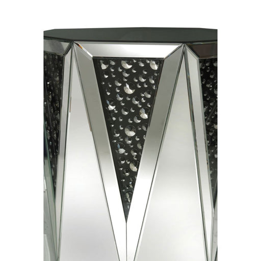 Featuring a dodecagon beveled mirrored table top that captures and reflects light from all angles. A beautiful drum base with faux diamonds that gl...