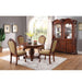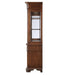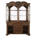 The Chateau De Ville hutch and buffet offers you plenty of space for all your fine dining accessories from napkin rings to serving platters. The top cabinet is accessed via two tall, arched doors and is outfitted with clear glass panels on the front and sides that allow you to clearly see the contents. Two single-door cabinets are built into the base of the unit, complemented by six pull-out drawers. The frame is built from solid hardwood with molded borders and carved side pillars. A floral medallion crowns the double-arched top.