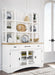 This server and hutch delivers casual style with substance. A classic white finish and butcher block oak veneer top add a relaxed vibe to a delicious design that exudes a modern farmhouse aesthetic. Cabinets, drawers and open shelves provide ample storage and display space for dining essentials and decor. This charmingly curated piece is a show of great taste.
