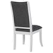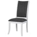 Dimensional grey upholstery creates engaging contrast and depth for this set of two modern dining chairs. Each boasts a tall, refined silhouette that's armless to create a smooth, streamlined silhouette. Cushions are padded with foam and covered in dark grey upholstery. A pearl white finish adds crisp, clean character, delivering a look that works beautifully in a variety of spaces and decor styles. Chairs are complete with flared front legs and squared edges that encourage a clean, precise look.