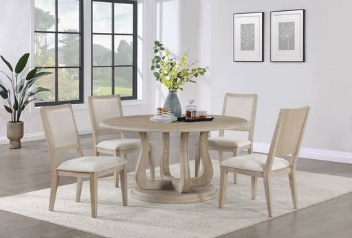 Infuse your kitchen or dining room with the inviting warmth of a modern farmhouse dining set that includes a round table and four side chairs. The ...
