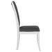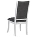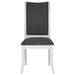 Embrace a modern minimalist presentation with this contemporary dining set. It centers on a roomy round dining table that seats four to six, with flared legs and a round shelf that adds stability and decorative potential. The set adds side chairs, each with a tall, structured silhouette and dark gray upholstery over plush foam cushions. A pearl white finish is clean and fresh, offering plenty of contrast against the gray. The set instills a clean, precise aesthetic, perfect for minimalist or maximalist decor themes.