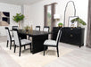 Captivating with a touch of Art Deco style, this black wood sideboard is a functional and fashionable addition to your dining room or living space. A great choice for expanding dining room storage, this chic sideboard is built of rubberwoods and wood products, sturdy and solid. A dramatic black finish embellishes linear groove designs on its door fronts and drawer fronts, adding a textural element to impart dimensionality. Find space for your serve ware and implements in a pair of top drawers and in shelving behind four doors. Drawers feature English dovetail construction on metal extension glides, and ornate metal hardware completes an artisanal look.