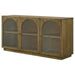 This versatile sideboard brings a blend of elegance and practicality to your dining room or living space. Crafted with hardwood, engineered wood, and oak veneer, it features a warm brown oak finish that enhances the natural beauty of the materials. Three wood-framed glass doors with arched designs offer a refined way to display your favorite dinnerware, decor, or collectibles. Inside, adjustable shelves provide ample storage, making this piece perfect as a buffet, server, or storage cabinet for any room. With its timeless design and functional versatility, this piece adds both sophistication and practicality to your home.