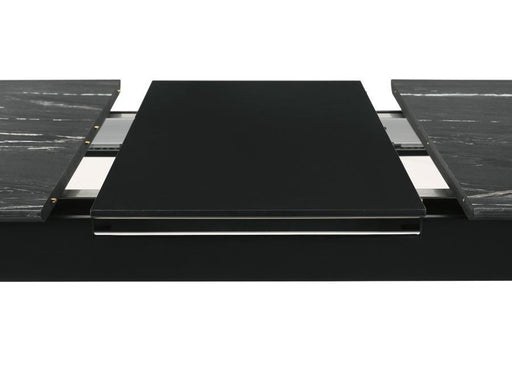 The luxurious look of faux marble creates a glam sensibility for a modern dining table. The black marble look of the tabletop complements a sleek b...