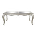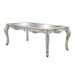 An ode to traditional glamour, the Devayne dining table brings in all the allure and charm that you are seeking for a dining table. The table features an extension leaf that allows for additional dinner guests. The champagne finish enhances the beautiful floral moldings on the legs and apron. The tabletop features mirrored panels that highlight your dinnerware.