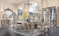 Bigger is always better, the Danae dining table is a true testament to that. Boasting immaculate details on the base and legs that are fit for royalty. This grand piece is sure to leave a lasting impression on everyone that feasts their eyes on it. The Champagne and gold accents help enhance the ornamental details.