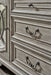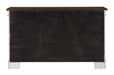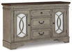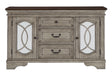 Serve up a sense of traditional cottage design with this dining room server. It features a pair of cabinet doors with inset mirrored glass and decorative fretwork. The server's three smooth-gliding drawers with dovetail construction and black felt bottoms are perfect for storing more delicate items. An antiqued gray body and rich deep walnut brown top, along with bail pulls and knobs finished in a dark bronze tone, complete the beautiful design.