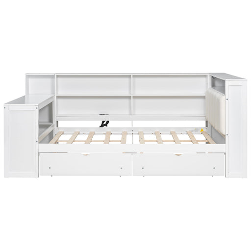Upholstered Headboard: Soft fabric with high-density foam for comfort during reading or lounging Built-In Storage: Multiple shelves and two drawer...