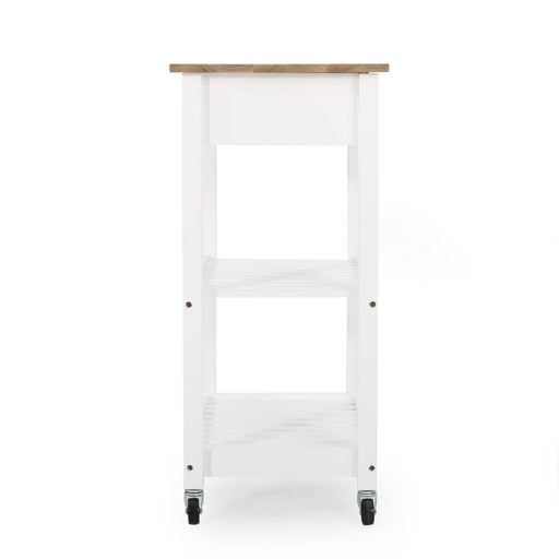 This versatile kitchen cart delivers functionality and charm with its natural brown top and white metal frame. A spacious surface provides room for...