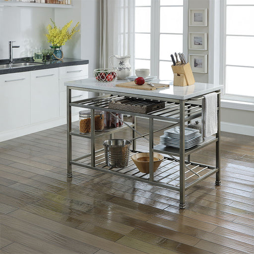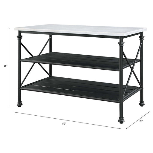 Give off a light and airy feel to a compact cooking space. The Mera Kitchen Island features a artificial stone top paired with a metal slatted shel...