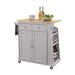 Add storage space and charm to your kitchen with this Tullarick wheeled kitchen cart. The stylish gray finish and natural wood top along with silver handles and pulls make this cart an adorable addition to cottage, contemporary or beach decor schemes. This modern kitchen island cart features ample storage for all your cooking needs with shelves, drawers, a condiment rack and towel rack. Some Assembly Required.