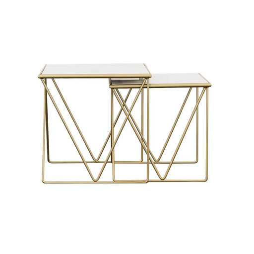 Soft gold adds an element of warmth to a two-piece set of modern nesting tables. Charming in a compact living space, the smaller table tucks under ...