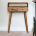 - Curved Console Table - This simple, elegant console table has beautifully curved edges to fit perfectly in any living space, this 100% solid mango wood unit has been built with sustainably sourced timbers and has two drawers and 1 open slot to help you keep your home organized and storing any little household objects. It has shiny knobs and has a fine finish with 4 Nordic style legs.