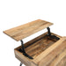 - Features split lift up top with large storage area and one (1) open compartment for plenty of storage