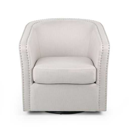 CONTEMPORARY DESIGN: Showcasing nailhead trims and a classic tub shape, this swivel chair embodies a truly contemporary style. BARREL CLUB CHAIR: ...