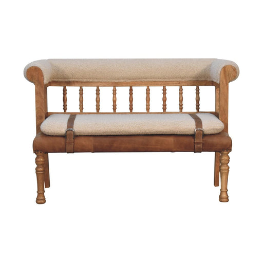 Artisan Furniture Solid Wood Honey Caramel Boucle Cream Nordic Bench - Derived from the French word for curled or ringed yarn or fabric. This hand...
