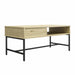 - Side drawer provides concealed storage for remotes, coasters, and small items