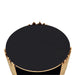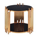 Add a fashion-forward touch of geometry to your living room with the asymmetrical metal tubing detail of the Tanquin table. This contemporary piece sits on a circular metal drum base with lower shelf. Some Assembly Required.