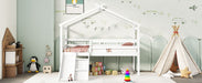 Twin Low Loft House Bed With Slide, Ladder, Safety Guardrails, House Roof Frame - White