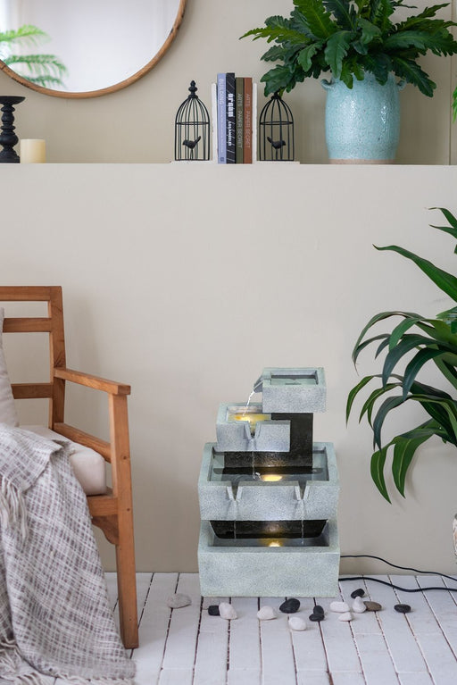 Modern Minimalism: This decorative fountain features a four-tiered block design, finished in an earthy gray hue, ideal for modern, industrial, ...