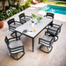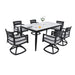 - Dining Set:Includes a rectangular table with a marble-inspired sintered stone top and 6 swivel rockers.