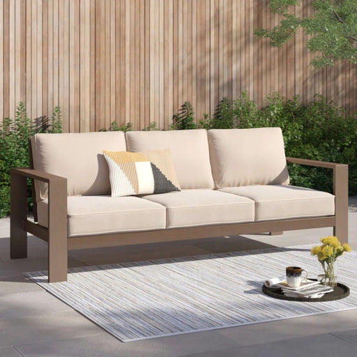 This outdoor sofa prioritizes versatile style and comfort, all while providing the durability you need al fresco. Crafted of a sturdy, wood-look ma...