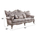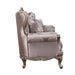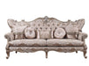 The Jayceon sofa collection is gorgeous, with shimmery fabric upholstery that highlights the champagne finish of the wooden frame. Button-tufted seatbacks wing out under carved arches. Loose seat cushions are upholstered in a floral patterned fabric that extends over rolled arms. A scrolled floral motif adorns each piece in this addition to Acme's exclusive design collection, including matching occasional tables.