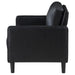 A compact profile makes this modern loveseat the perfect choice to add seating in a living room or den. It's a structured silhouette complete with track arms. Faux leather upholstery is supple and smooth, offering contemporary style and sophistication that impresses without overwhelming. Plush cushions provide wonderful comfort for lounging, with sinuous spring decking under seats and a webbed back. Tapered, straight legs offer a chic finishing touch, providing support and stability.