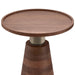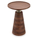 - Multi-functional table features spacious round solid acacia top, antique brass look stem and solid acacia cone shape pedestal base