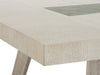 Gracefully-designed with a modern sensibility, the simple contemporary profiles of the Lenox Collection of dining room furnishings come alive with architectural elements and mixed materials including wood, metal, glass and clear mirror. Crafted of Random Width Cathedral White Oak Veneer and Hardwood Solids, Lenox combines the soft Acadia White finish with Warm Silver metal accents and Bronze Glass for a refined and romantic elegant glam. A signature geometric fretwork in the Warm Silver finish appears on the dining chair backs, giving a designer flair to the collection. Metal ferrule caps in the warm silver finish on the dining table, chair and bench legs are a sophisticated touch and complement the Silver Mist hardware. Bring grace and glamour to your home with the Lenox Collection.