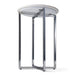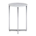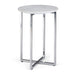 - Featues a round marble table top complemented by an X shaped stainless steel base
