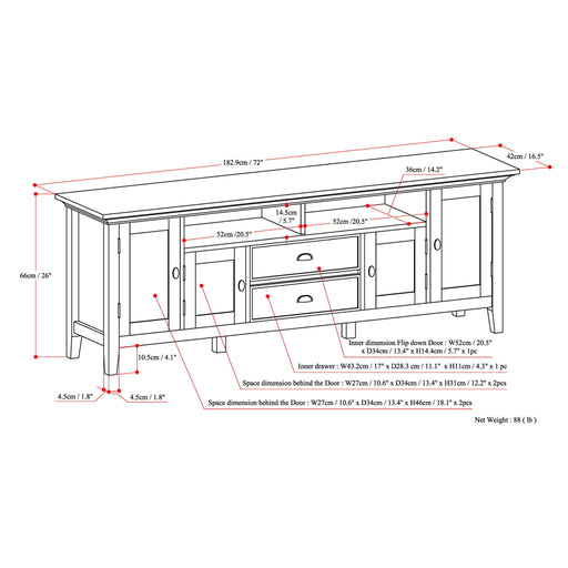 DIMENSIONS: 16.5" D x 72" W x 20" H Handcrafted with care using the finest quality solid wood Hand-finished with a Russet Brown stained and glazed...