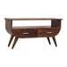 - Features: solid mango wood, chestnut finish, nordic-style legs, t-bar handles, open shelf,